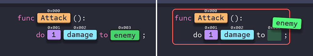 One of the game's main mechanical twists is the ability to use numbers to reference other components as "pointers." This feature was based on the use of memory addresses in low-level programming languages like C, and their real-world function in computing.There is a niche of players, specifically in the speedrunning community, who discover and develop highly complicated exploits in games which manipulate pointers in order to perform arbitrary code execution (ACE) and force the game to do whatever tasks they desire.My goal was to recreate the enjoyment and fascination with discovering these exploits, and allow players to do similar actions in the game. As a part of this, I wanted the feature to be always present, and if possible, never explicitly pointed out. This would recreate that feeling of discovering, and the joy that the player has suddenly gotten away with something.